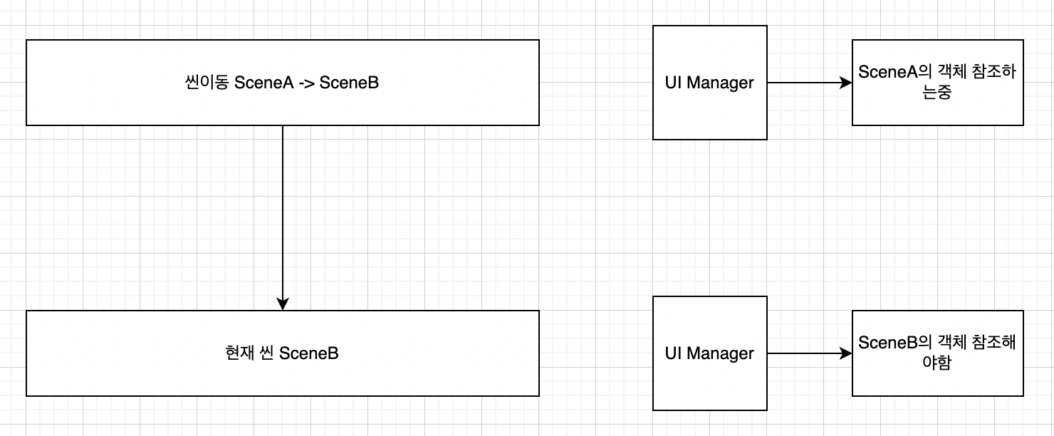 DontDestroyOnLoad로 UIManager을 만들어서 씬이 이동될때 마다 참조 하려고 한다. 천번째는 object.find로 참조 하고 Tag같은 기능으로도 참조 하려고 하는데, 헷갈리는게 씬이 이동하고 어느 부분에서 매서드를 호출해야 하는지 헷갈린다..