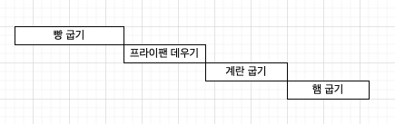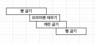 이렇게 빵을 구우면서 프라이팬에 불을 올려 데우고 데워지면서 계란을 굽고 나서 거의 다 구웠을쯤에 한켠에 햄을 굽기를 하면 이렇게 작업시간도 단축이 된다. 다음은 비동기(Asynchronous) 동시에 일어나지 않는다는 말 이다. 우리가 처음에 본 그림과 같이 먼저 앞에 일을 처리 하고 그 다음 일을 처리하기 시작한다.