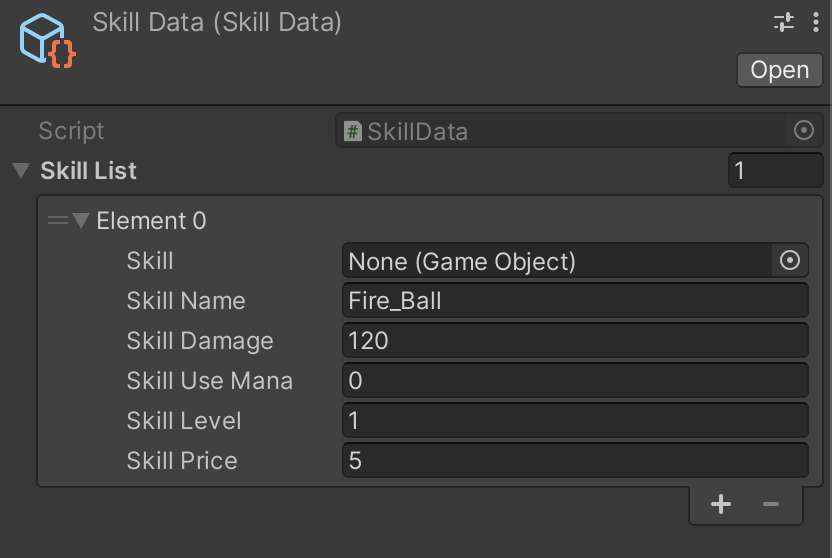 스킬의 프리팹을 받고, 스킬의 이름, 스킬의 데미지, 스킬의 소모 마나 등 데이터를 스크립터블 오브젝트로 관리해줍니다.