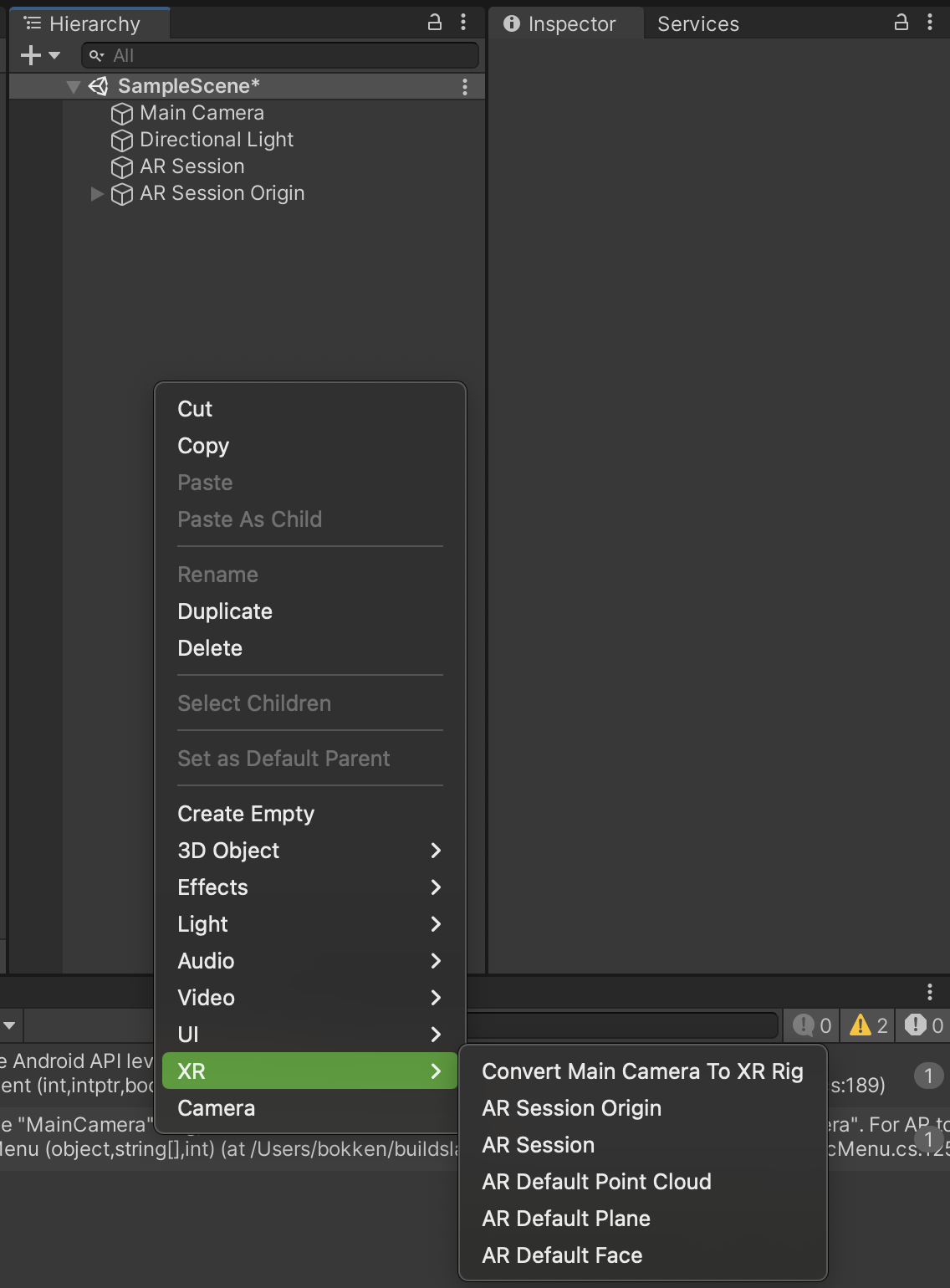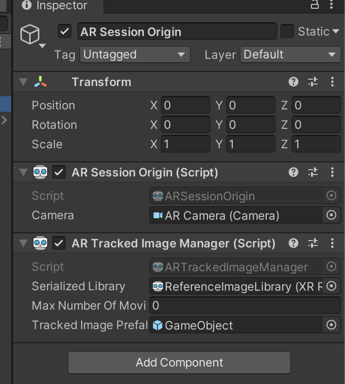 - AR Session Origin 추가 - AR 요소들을 유니티 공간에 Transformation 하기 위해 필요함