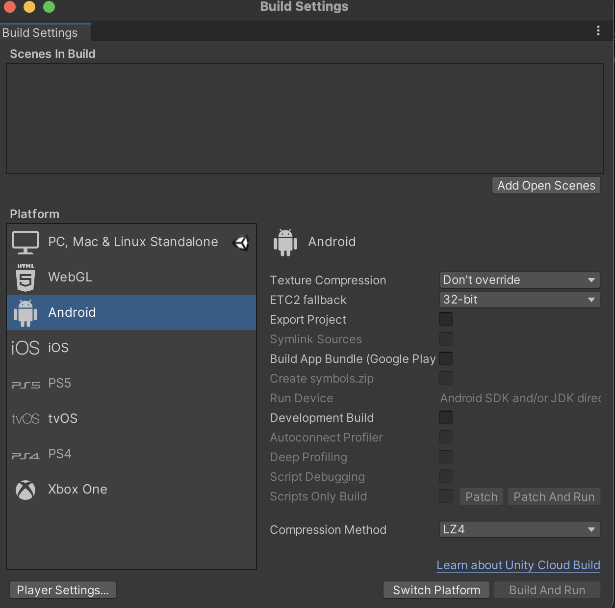 프로젝트의 빌드 세팅에서 안드로이드로 플랫폼을 변경