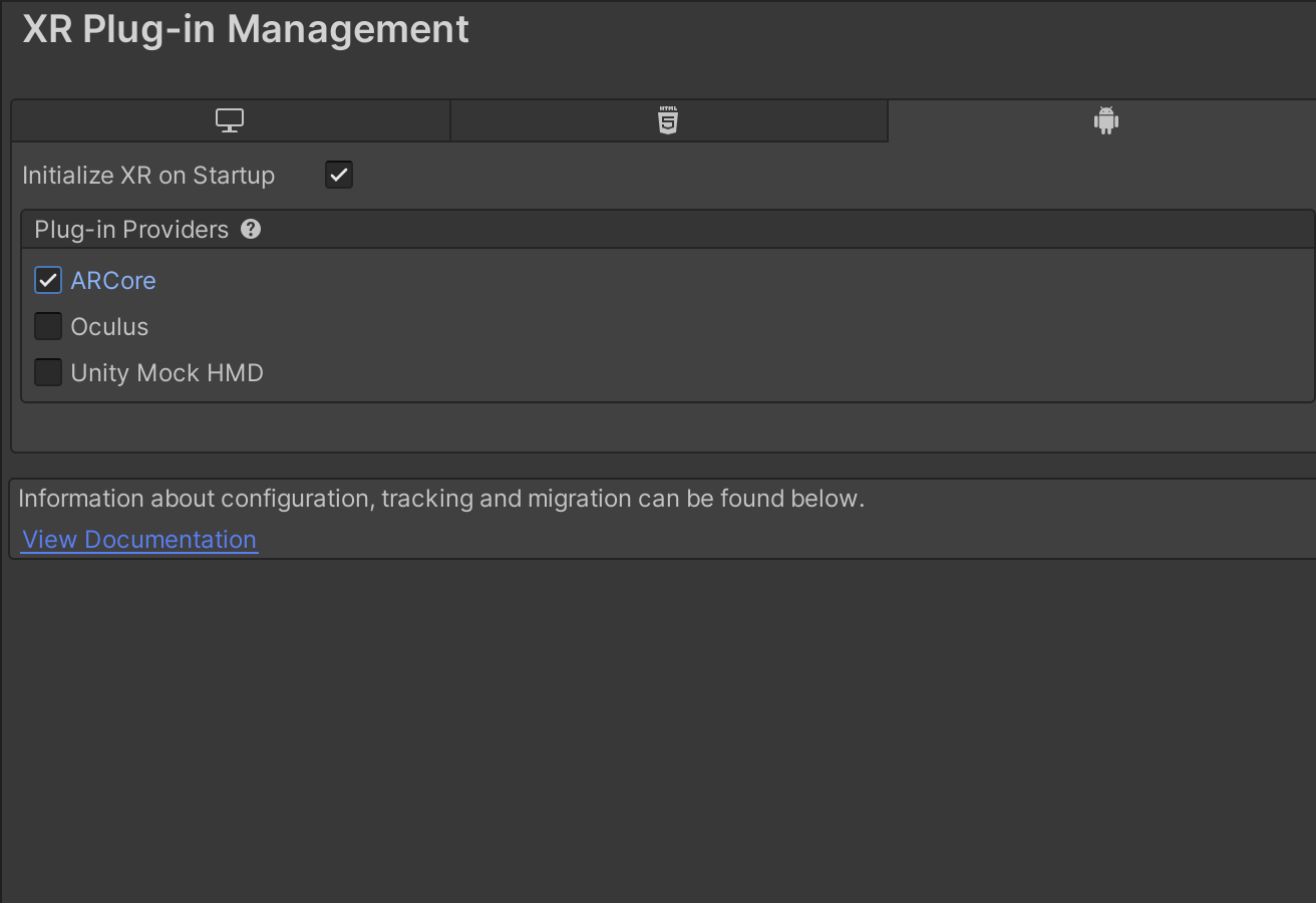- XR Plug-in Management - AR Core 선택